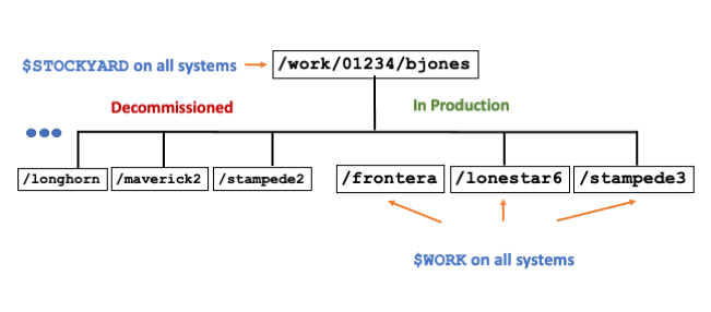 1 TB, 3,000,000 files across all TACC systems Not intended for parallel or high−intensity file operations. See Stockyard system description for more information. |